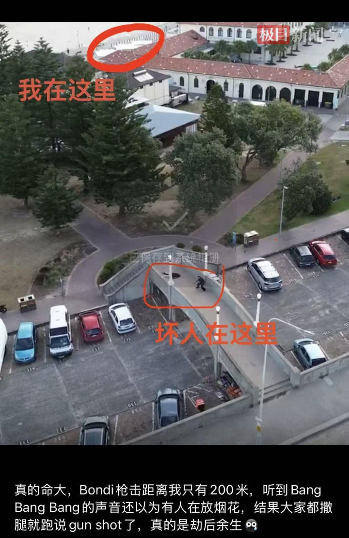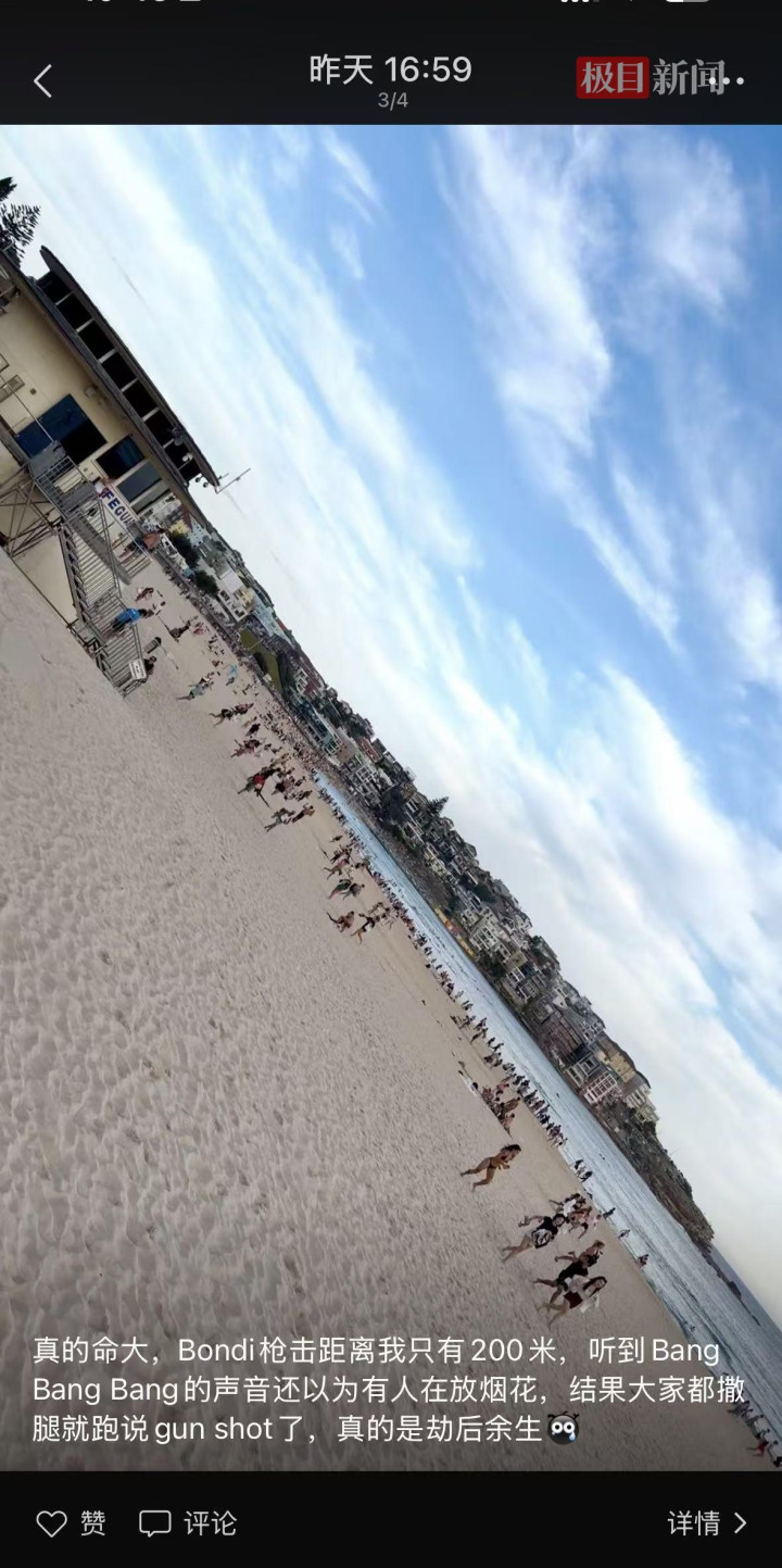 12月15日,极目新闻记者联系到一名在悉尼留学的旅行博主“jin10Apr”,他在邦迪海滩亲历了枪击事件。其告诉记者,事发当天天气晴朗,气温32摄氏度左右,邦迪海滩是网红海滩,是游客必打卡的地方。在博主发来的他抵达邦迪海滩的照片中,可以看到海滩上有很多人在晒太阳,海水里也有很多人在游泳,“人很多,跟下饺子一样。”